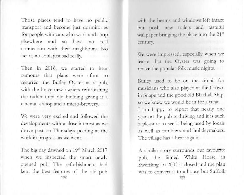 Come in at Random in any Key you like continues in similar vein with chapters featuring goings-on at the Alderton Swan and the Sweffling White Horse, where the furniture and fittings reminded Sue of those of the flat she and Pete moved into in Southend when they were first married in 1970. There’s a whole chapter about music at The Sorrel Horse and the temptation to join in or not to join with songs that no one knows. It’s hilarious. Sue is full of praise for The Columbines, an all-female trio she saw at this Shottisham pub and whose song, “Silver Gilt Strings” about the piano left for people to play on the beach at Harwich during the 2013 Arts festival. The chapter “Sunshine and Sadness” moves onto the more serious subject of politics with mentions of Brexit, Trump, the murder of Jo Cox, the Manchester bombing, the Westminster Bridge atrocity and Grenfell. Subsequent chapters focus on Doris (the singing barmaid) and The Desperadoes; the town of Leiston; food and folk music at The Froize. The final chapter celebrates the re-opening, after several years of Butley Oyster. Once again musicians congregate and play there once a month.