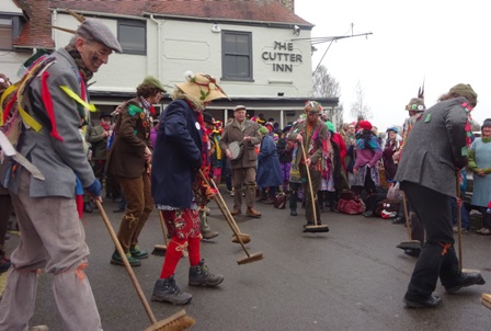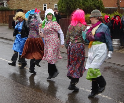 The hosts, Ouse Washes, along with Gog Magog, Kit Witches, Misfits and Oxblood are much more colourful, having either raided the charity shops for miles around or made multicoloured patchwork outfits as part of their disguise; all their dancing is energetic. The Kit Witches though seem to have taken the pantomime dame as their inspiration and the enormous balloons wandering about in the bodices of men and women alike are rather distracting. I remember that as a result of our side dancing in Charlie Manning’s Amusement Park in the 1970s, we were told that we had brought Morris dancing into disrepute. What would that person have said about the Kit Witches? If you can rise above the wigs, dame make up and balloons though (the balloons are certainly rising and trying to escape in any way they can) they are good dancers and they do seem to enjoy their dancing.