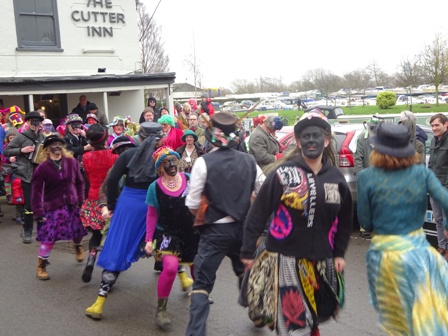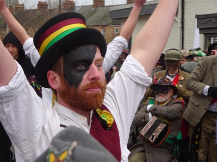 They and the fun, rainbow-coloured outfits of Gog Magog, Ouse Washes and Oxblood Molly brightened up a very overcast and subsequently wet day; only to be expected in January I suppose. Appropriately enough, given the face make up, the Misfits did one of their dances to the Rolling Stones’ “Paint it Black”. This set us fantasising about a whole molly dance set built around such numbers as “Black is Black”, “Back to Black”, “Black Magic”, “Black Night” etc. You can probably think of lots of others.