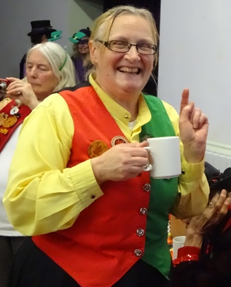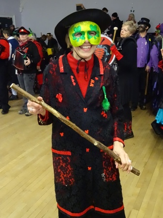 Anyway back to Halesworth: giving a St Patrick’s Day twist to their event with green face masks and shamrock, Oxblood started with massed dances arranged beforehand for every genre of dance represented. But as we were the only ones, with the help of a sole Danegeld dancer, able to make up a complete North West side we were on our own – slightly nerve-racking as “Carr Lodge” is quite a new dance to us and we were by no means sure of it, but the sprung wooden floor lifted us all. After the massed dances, it was turn and turn about. Informality and lack of a public audience meant that those intrepid, but lone, souls representing their absent sides could join in. (Quick run-through in the men’s cloakroom anyone?) Between dances friends chatted and relationships between sides were renewed.